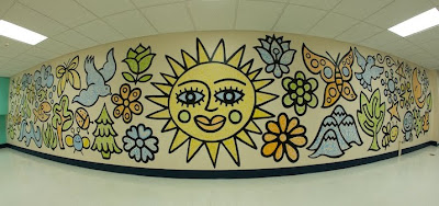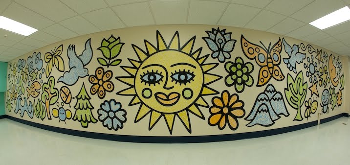 In January of this year, I was the Artist-in-Residence at School, where I worked with a group of 15 eighth graders. I taught them the differences between a fine artist and an illustrator, and then worked with them on developing their own symbols and patterns. I then designed a mural with my own icons (based on an environmental theme) and they filled in my black icons with their symbols and patterns in color. The mural was amazing…the students did a great job. I believe I found a unique way to create professional looking murals that combine my style and love of icons with the work of developing artists. This combination of using my work as the main theme and working with the artists in a particular organization is extremely powerful visually and rewarding for me personally. These murals have the ability to turn a space that is unnoticed, into a space that’s alive and the process creates self-esteem and confidence in young people. The fact that illustration can be used in this way is really exciting!