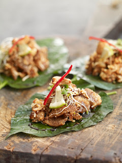 Miang Pla Grob – crispy fish with cashewnut and coconut served on a fresh betal leaf