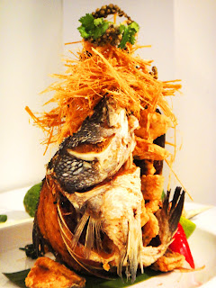 Lemongrass whole fish – Whole Barramundi filleted boneless, then crispy fried and served with lemonsgrass floss and chilli dressing.